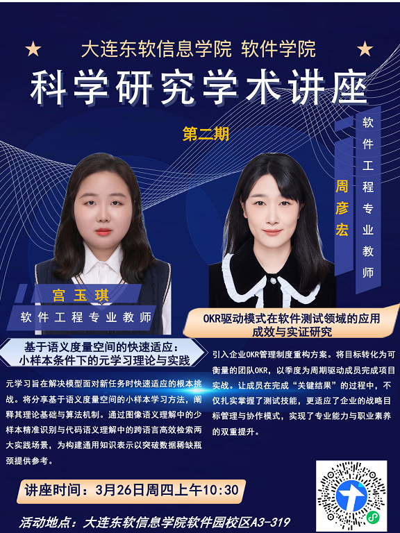 为加强软件学院专任教师科研能力建设,推动教师间的学术互动与协作,进一步激发科研活力与创新思维,3月26日,软件与大数据技术系在软件园校区A3-319会议室顺利举办软件学院2026年度第二场科研学术讲座。本期讲座中,宫玉琪老师围绕基于语义度量