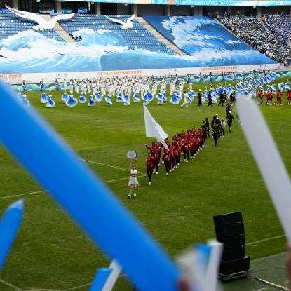 抵达场馆后,主办方为到场的东软学子分发了色彩鲜艳的应援棒。走进球场,璀璨的灯光、动感的音乐瞬间点燃了新生们的热情,大家纷纷挥动应援棒,在观众席上组成了亮眼的“东软方阵”。随着开幕式正式拉开帷幕,精彩的文艺表演、各参赛队伍的入场仪式轮番上演,现场掌声与欢呼声此起彼伏。