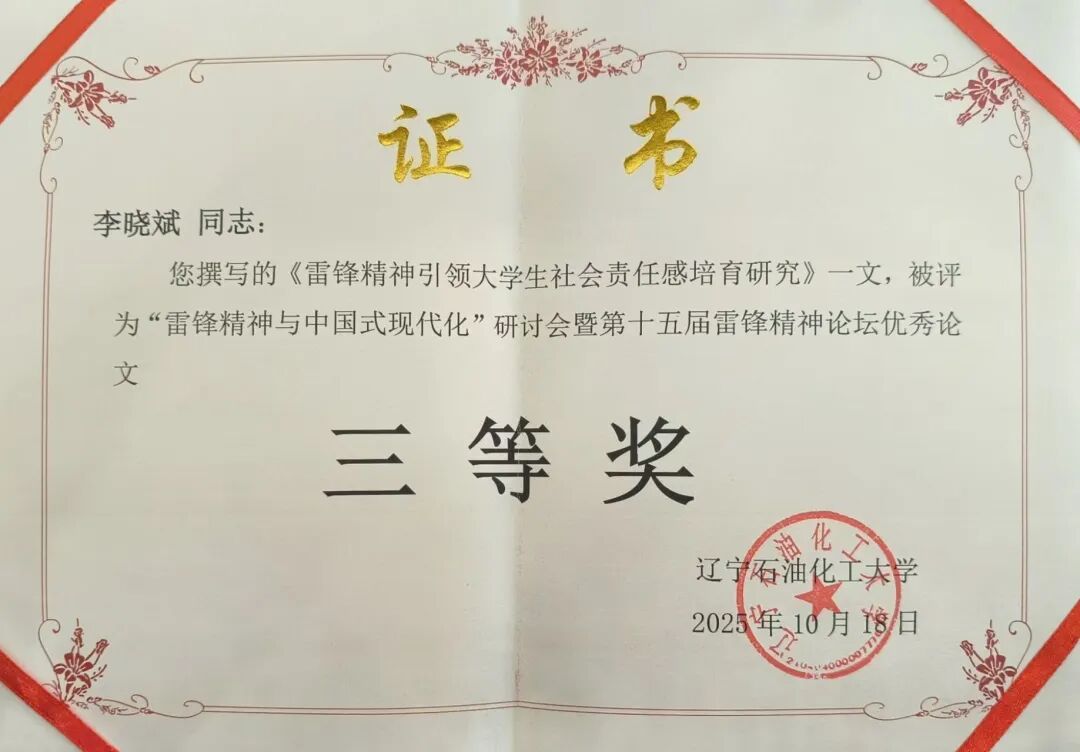 近日,全国“雷锋精神与中国式现代化”研讨会暨第十五届雷锋精神论坛在辽宁石油化工大学召开,全国百所高校代表参加。我校素质教师李晓斌受邀参会,其文章《雷锋精神引领大学生社会责任感培育研究》获优秀论文三等奖。