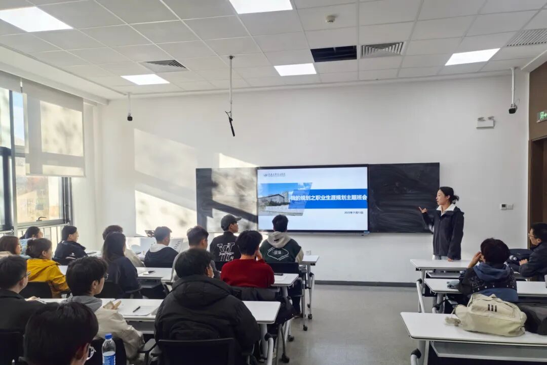班会紧扣学校入学教育第三阶段“我的规划”主题,王安开展实操指导,演示北森生涯教育一体化平台的职业测评、规划制定等核心功能。她介绍,平台生成的个性化电子生涯计划书,是自我认知、明确短板的参考,也是参与职业咨询和职业规划大赛的基础;同学们还需填写《素质教育手册》职涯部分,形成“线上+线下”规划闭环。同时,王安动员大家以本次班会为起点,利用平台打磨方案,积极参与2025年全国大学生职业规划大赛学院选拔,争取晋级更高赛场。