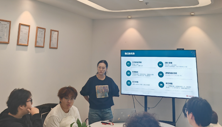 在企业的校企合作部门工作人员葛晓彤的引导下,学生有序参观了企业数字化办公区,明亮整洁的环境与高效协同的工作氛围,让学生对职场场景有了具象认知。随后的交流座谈会上,葛晓彤详细介绍了企业发展历程、核心业务、岗位设置、招聘要求及薪资待遇,深入解读实习培养体系,让学生全面了解行业前沿动态。骆伟表示,校企合作是培养应用型人才的关键路径,希望学生珍惜机会,精准对接企业需求,明确学习与职业方向。