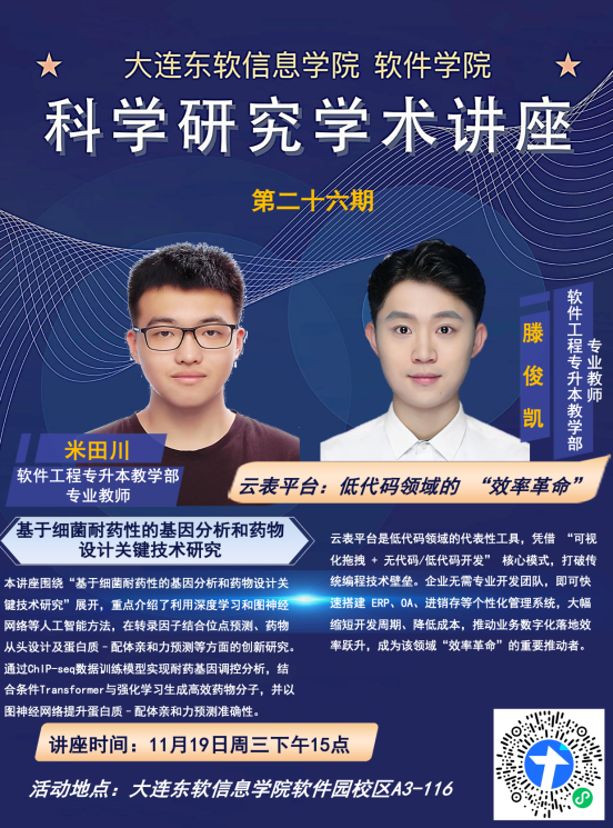 为持续深化科研创新氛围,拓宽教师科研视野,促进多领域技术交流与成果共享,2025年11月19日下午,软件学院在软件园校区A3-116会议室举办第二十六场科研学术讲座。本次讲座由米田川老师与滕俊凯老师联合主讲,软件学院专任教师与同学们积极参与,现场学术氛围浓厚。